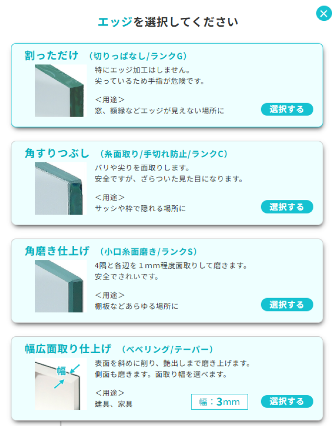 ご注文の際に、形状やエッジ仕上げはお選びいただけます。