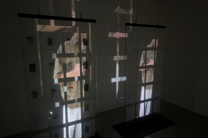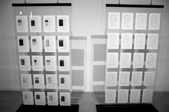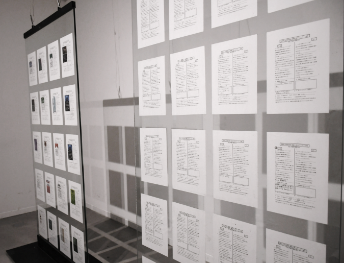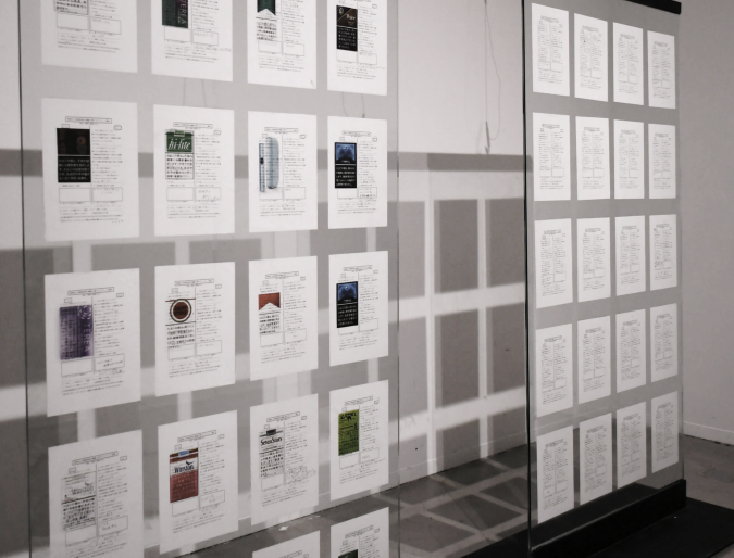 高さ1800mm幅900mm厚み5mmの板ガラス2枚に喫煙に関するアンケート調査用紙を挟み、そこに「タバコを吸う直前の動作」をする人々の映像を投影した作品。