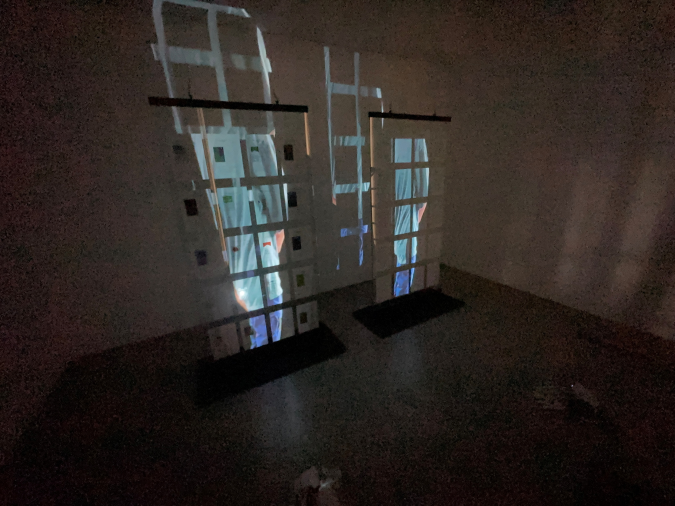 よって映像はアンケート用紙に投影されたものと、透過され背後の壁に映るものに分かれる。