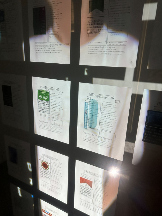 一方の板ガラスには非喫煙者へのアンケート用紙のみを挟み、もう一方には喫煙者へのアンケート用紙と喫煙銘柄の画像を挟んでいる。