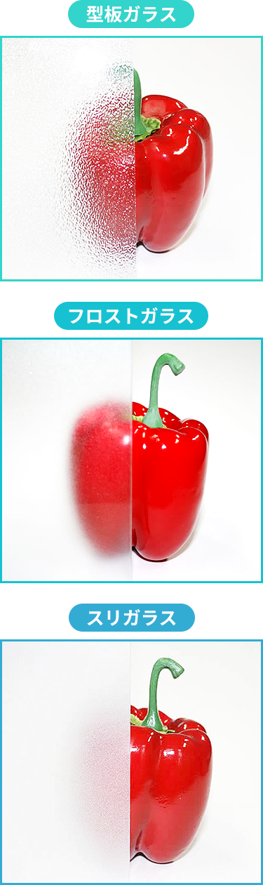 型板ガラスは、ガラスの片面に施したデザインの凹凸で光が乱反射し、ガラス越しの風景や像がぼやけたり、形がゆがんで見えます。